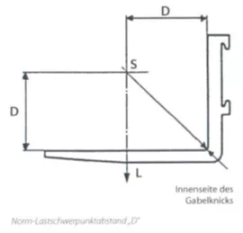 Der Hersteller geht dabei von einem Norm-Lastschwerpunktabstand „D“ (auch in der Höhe) und einer Norm-Hubhöhe aus. „S“ bezeichnet in der Abbildung den Lastschwerpunkt (nach DIN EN 3691).